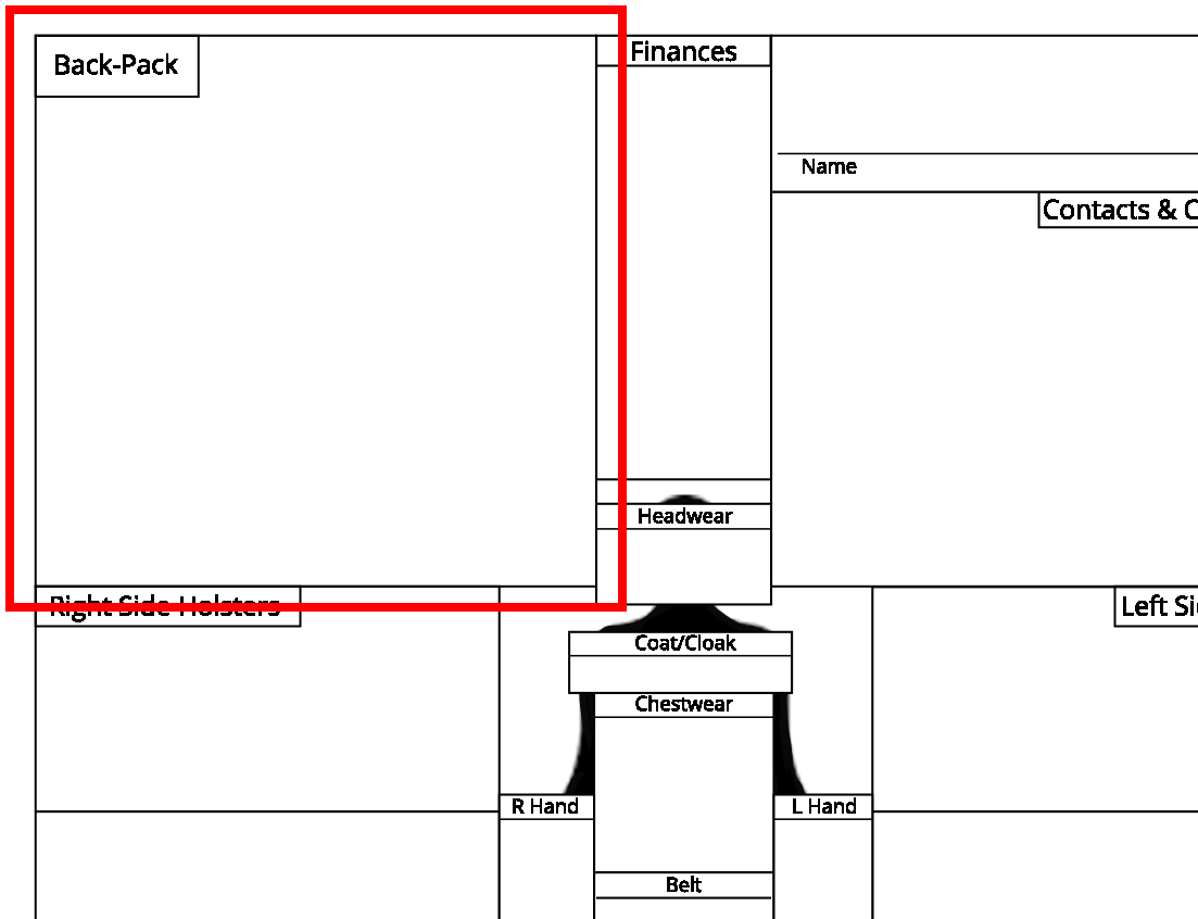 This section is for you to record your character's finances. Things such as: regular income, loans, bets, deals and stored funds.