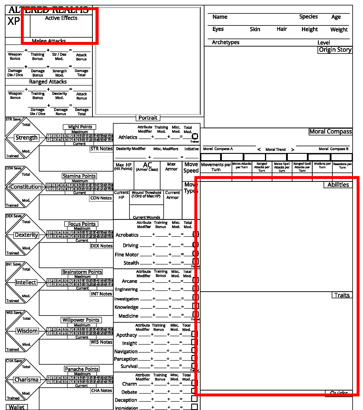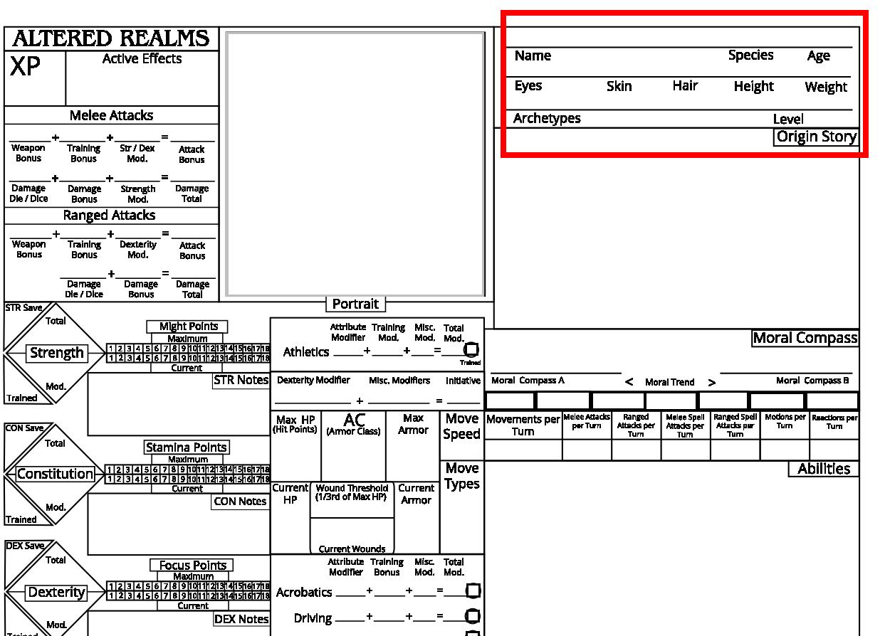 Altered Realms, like most Tabletop RPGs, utilizes characters sheets to track and quantify information about the characters we are roleplaying. While it may seem intimidating at first, this guide will help you become familiar with every aspect of the character sheet, and will have you ready to play the game in no time. Below is the 1st page of a standard Altered Realms character sheet. The following section will briefly explain each of the visible elements, from where they are derived and how to fill them out.