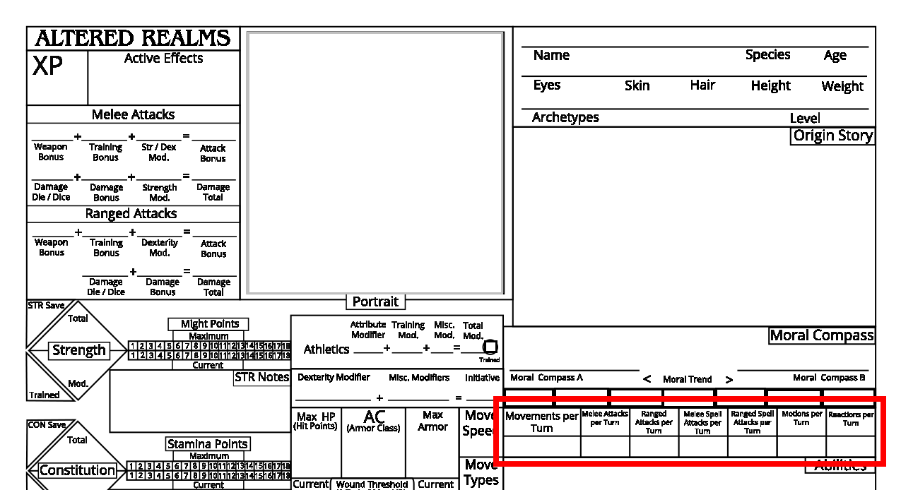 This section of your character sheet allows you to quickly check how many acts of a given type your character has available to them. These values are affected by a number of various Species and Archetype Traits.