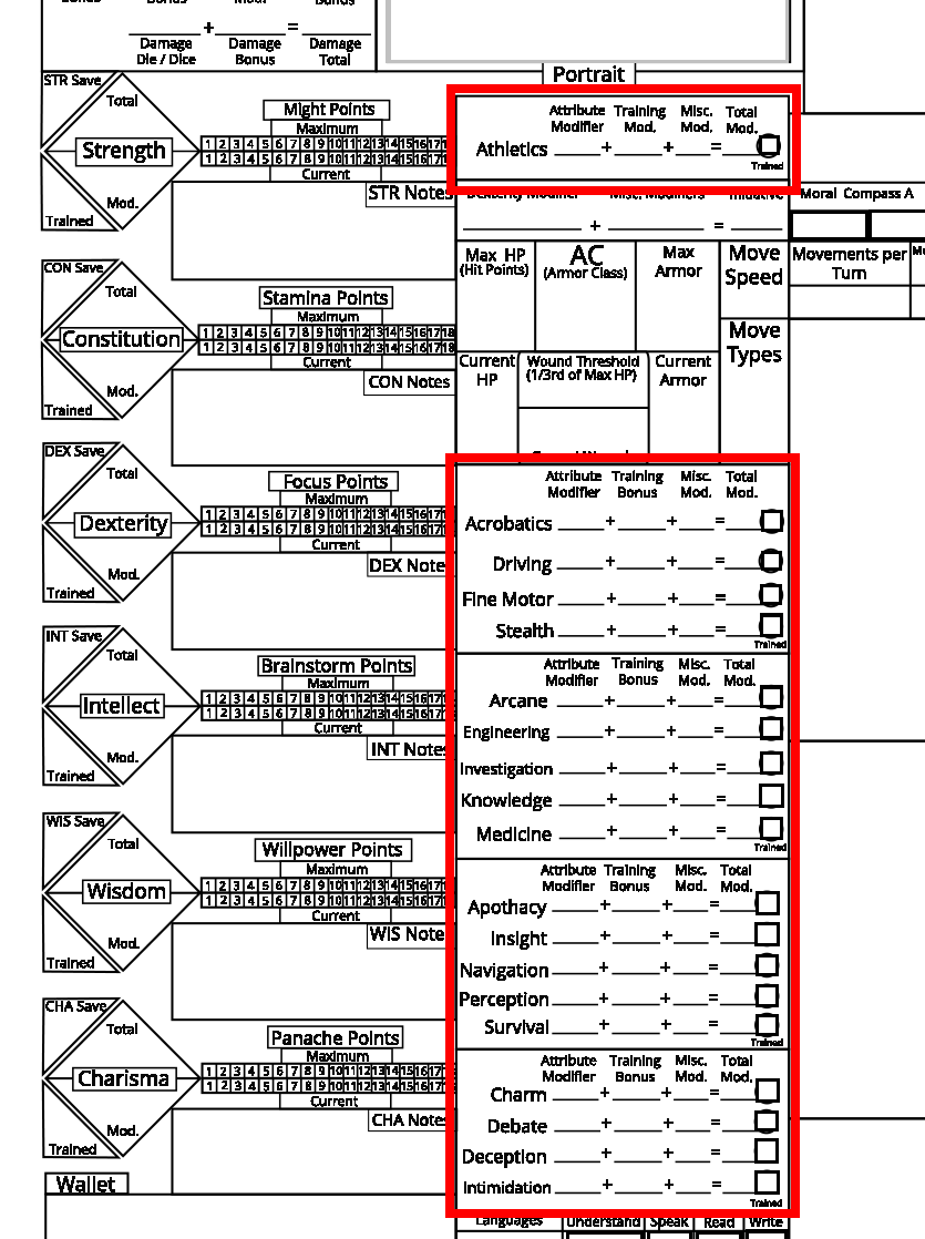 Skills are how your character will perform complicated tasks that require skill and experience. They are determined by your Species, Traits, Archetype and Attribute Modifiers. You Training Modifier is a flat bonus applied to all skills of which your character is considered to be trained. It is derived from your characters Level and Traits. Miscellaneous Modifiers are often acquired through Traits and Abilities or Temporarily through Spells.