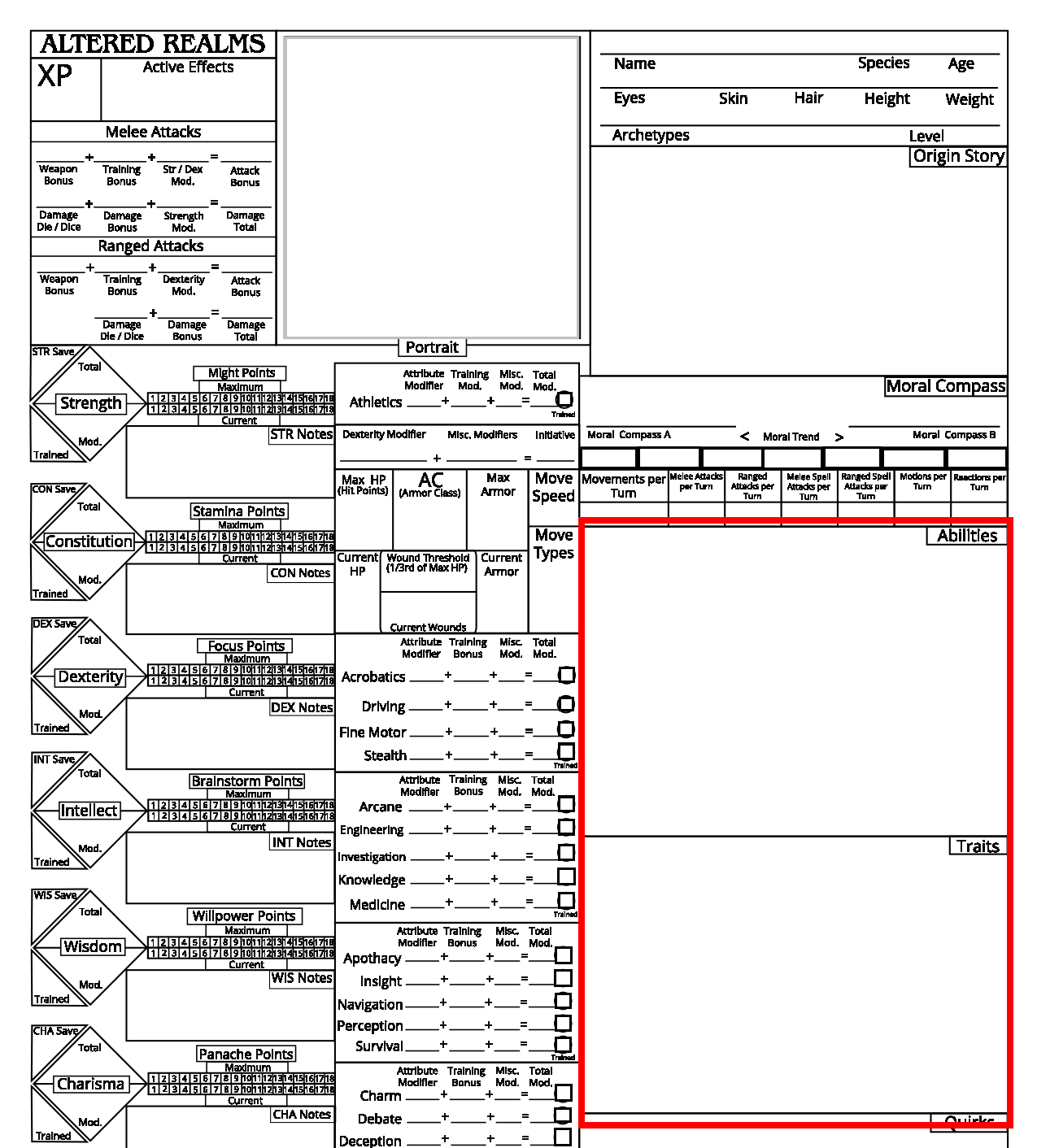 Traits and abilities are the modular building blocks of Altered Realms characters. They allow players to quickly choose what their character can do and how well they do it.